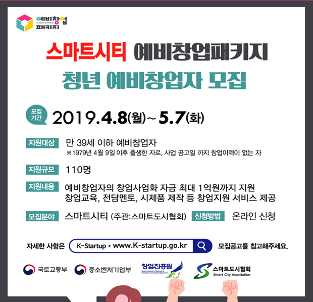 국토교통부에서 4월8일부터 5월7일까지 스마트시티 분야 청년창업을 지원하기 위한 일반시민과 학생 등을 대상으로 스타트업 지원과 창업지원을 위한 청년 창업가 공모를 실시할 예정입니다. 예비 창업자 110명을 선정해 시제품 제작과 마케팅, 멘토링 등의 제품과 서비스 지원정책을 바우처 형태로 지원해 최대 1억원까지 지원할 계획이니 스타트업에 관심있는 예비 창업가들께선 공모 신청을 고려해 보시는 것이 좋겠습니다.