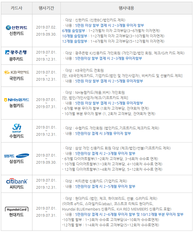 신한카드, 우리카드, NH농협카드 무이자 혜택 추가 제공(~'19.7.31)
