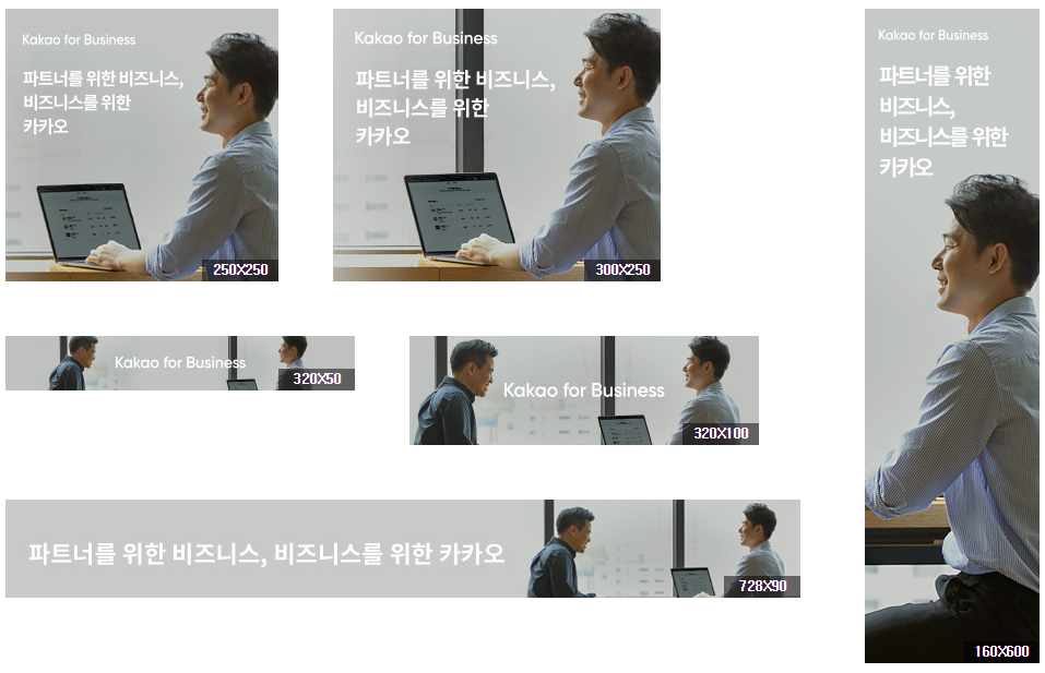광고 신청은 ①매체유형 선택과 ②광고단위 등록, ③스크립트 발급의 순서로 진행되며, 이를 위해 우선 광고관리에서 매체등록을 선택하고 매체명(블로그명)과 매체 고유값(인터넷 주소)를 입력 후 광고단위 등록을 클릭한다. 광고단위는 나의 웹사이트에 등록할 광고의 Type을 선택하는 것이다. 광고의 배너 유형을 선택하는 것인데, 가로*세로 기준으로 160*600, 250*250, 300*250, 320*100, 320*50, 728*90 사이즈의 배너 유형을 선택할 수 있다. 광고의 크기별 유형을 예시 화면으로 보면 다음과 같다.