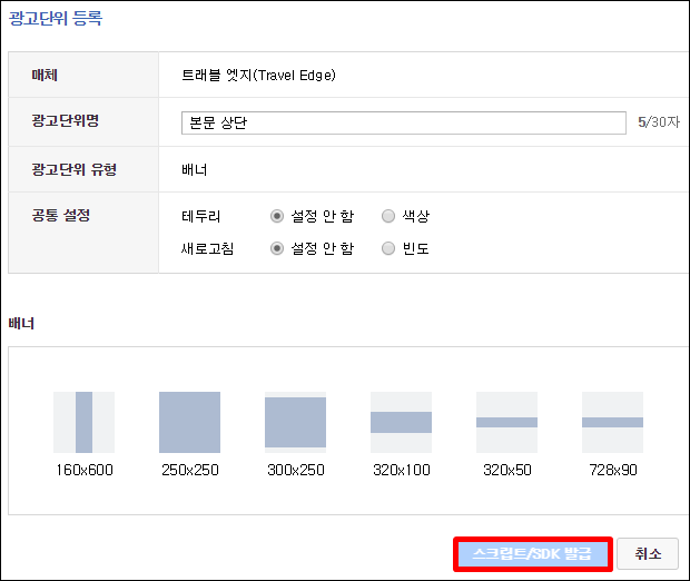 광고단위를 선택해 스크립트/SDK 발급을 클릭하면 html 스크립트 소스가 발행된다. 이 html 소스를 홈페이지에 적용시키면 된다. 블로그나 홈페이지 본문이나 사이드바에 해당 광고를 위치시키면 되며, 가로 세로 사이즈에 맞춰 광고단위를 선택하면 된다. 예를 들어 사이드바에 적용 가능한 광고 배너는 160*600, 250*250, 300*250이 될 것이며, 본문에 적용 가능한 광고 유형은 320*100, 320*50, 728*90 정도가 적절할 것이다.