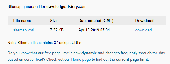 이제 다음 화면의 보안코드와 옵션만 넣고 생성(Create free XML Sitemap)을 클릭하면 사이트맵 파일을 다운로드 받을 수 있다. 티스로티 URL과 보안코드, 그리고 옵션을 선택해주면 된다. 옵션 중 UTC는 국제표준시 기준으로 사이트맵을 제작하는 것을 의미하며, subdomain을 선택할 경우 하위 도메인에 대해서도 사이트맵에 포함시켜 주게된다.