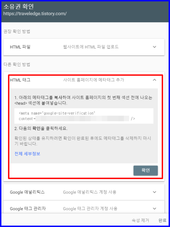 속성이 확인되면 도메인 소유권 확인작업을 진행합니다. HTML 파일 업로드의 방법이 있으나, 우리는 티스토리를 기준으로 조금 더 간편한 방법을 이용하기 위해 HTML 메타태크를 추가하는 방식을 활용하고자 합니다. 소유권 확인 하단의 다른 확인 방법 중 HTML 태그를 선택합니다.