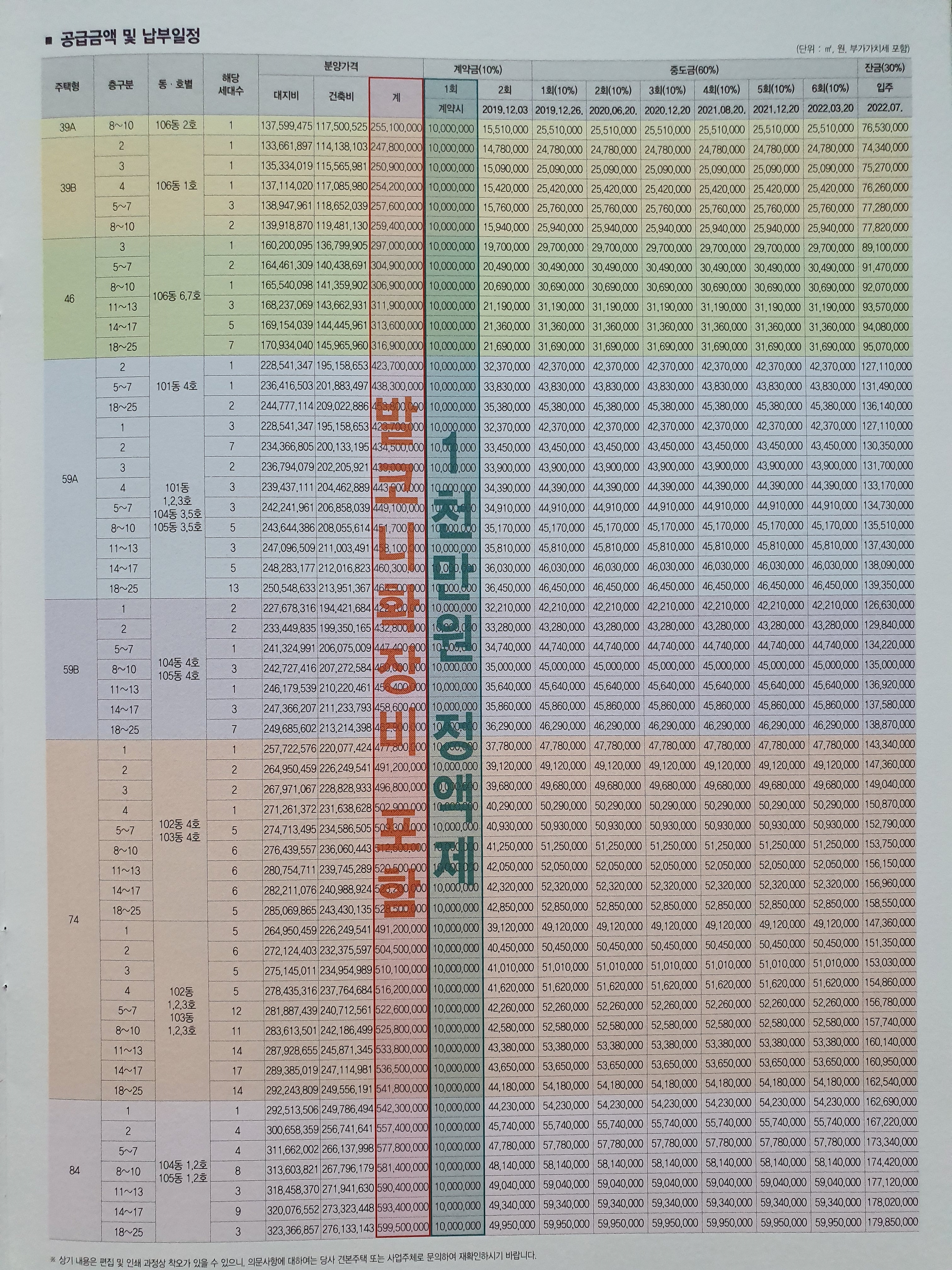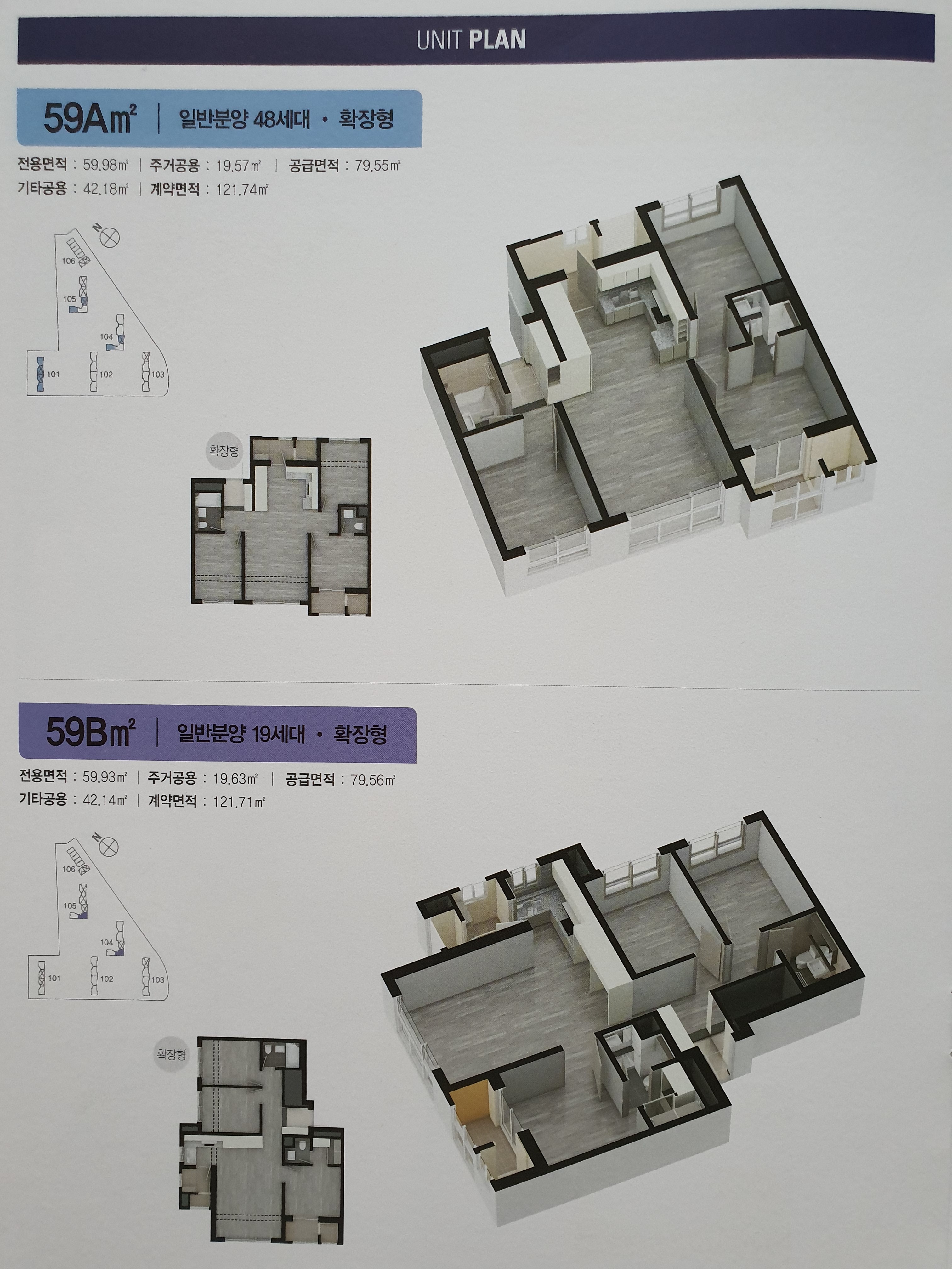 일반분양 물량 중 Type별 분양 세대는 39A 1세대, 39B 8세대, 46㎡ 19세대, 59A 48세대, 59B 19세대, 74㎡ 123세대, 84㎡ 32세대로 일반 청약 시 84㎡와 59㎡의 인기가 상대적으로 높을 것으로 전망됩니다. 타입이 동일한 84㎡나 74A와 달리, 59㎡의 경우에는 판상형이자 3베이로 구성되어 있는 59A 타입을 선호할 것으로 판단됩니다.