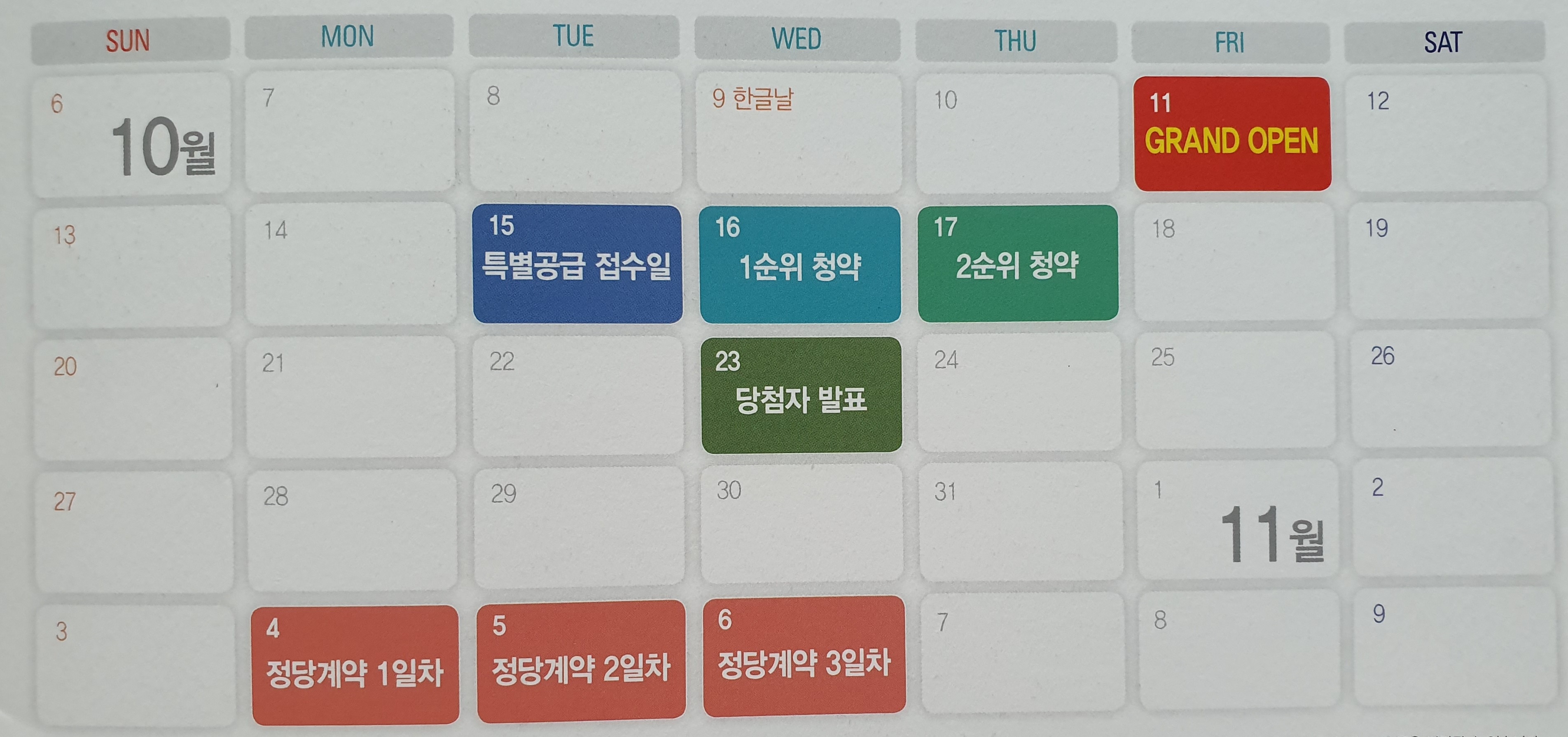 일반분양 청약 일정은 10.15(화) 특별공급, 16일(수) 1순위 청약, 17일(목) 2순위 청약이며, 당첨자 발표는 10.23(수) 입니다.