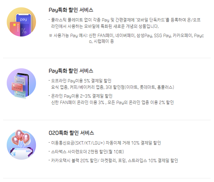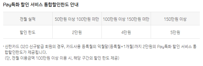 신한 o2o 카드는 전월 실적에 따라 페이 특화 결제일 할인 서비스가 제공되며, 50만원 이상 100만원 미만은 2만원, 100만원 이상 150만원 미만은 4만원, 150만원 이상의 경우에는 월 최대 5만원까지 할인 한도가 제공된다. 카드 발급 시에는 카드 등록월의 익월말까지 2만원의 초기 할인한도가 제공된다.