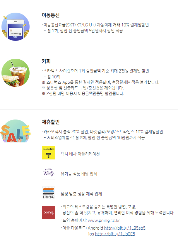 또한, 카카오택시 블랙 20% 할인과 마켓컬리, 포잉, 스트라입스 10% 결제일 할인 혜택도 제공한다. 해당 제휴 혜택은 업체별로 월 2회, 할인 전 승인금액 기준으로 10만원까지 혜택이 적용된다.