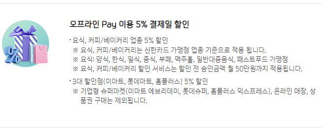 신한 o2o 카드의 가장 큰 혜택은 오프라인에서 휴대폰을 이용한 Pay 결제 시 요식 업종과 커피/베이커리 업종, 3대 할인점(이마트, 롯데마트, 홈플러스)에서 사용 금액의 5%를 결제일에 청구할인 해주는 것이다. 오프라인 페이류 결제 시 5%의 사용금액 할인 서비스는 현존하는 신용카드 청구할인 서비스 중 가장 높은 수준의 할인율을 자랑하는 혜택이다.