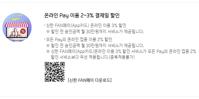 온라인 페이 결제 시 신한 FAN페이 3%, 기타 페이 2% 결제일 할인