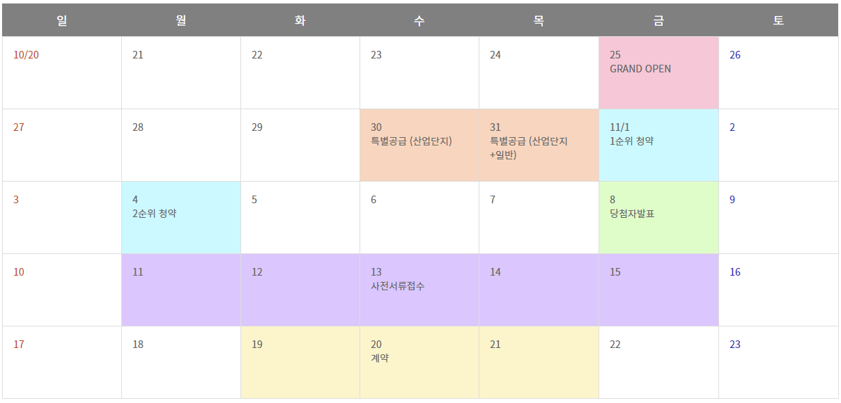 분양일정은 10.25(금) 견본주택 오픈과 함께 10.30~31 특별공급, 11.1 1순위 청약, 11.4 2순위 청약, 11.8 당첨자 발표, 11.19~21 정당계약 등으로 진행됩니다.