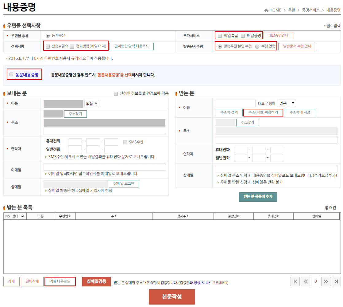 만일, 받는 사람이 여러명이라면 받는분 선택 시 주소(파일) 이용하기를 클릭해 빠르게 내용증명 발신 신청을 할 수 있으며, 하단의 받는분 목록을 엑셀 다운로드해 발송 내용이 정확한 주소로 발송이 되었는지 검증을 할 수도 있다. 보내는 분과 받는 분을 정확하게 선택 후 본문작성을 추가하여 내용증명 문서를 작성하면, 이제 내용증명 문서는 인터넷우체국을 통해 쉽게 발송할 수 있다.