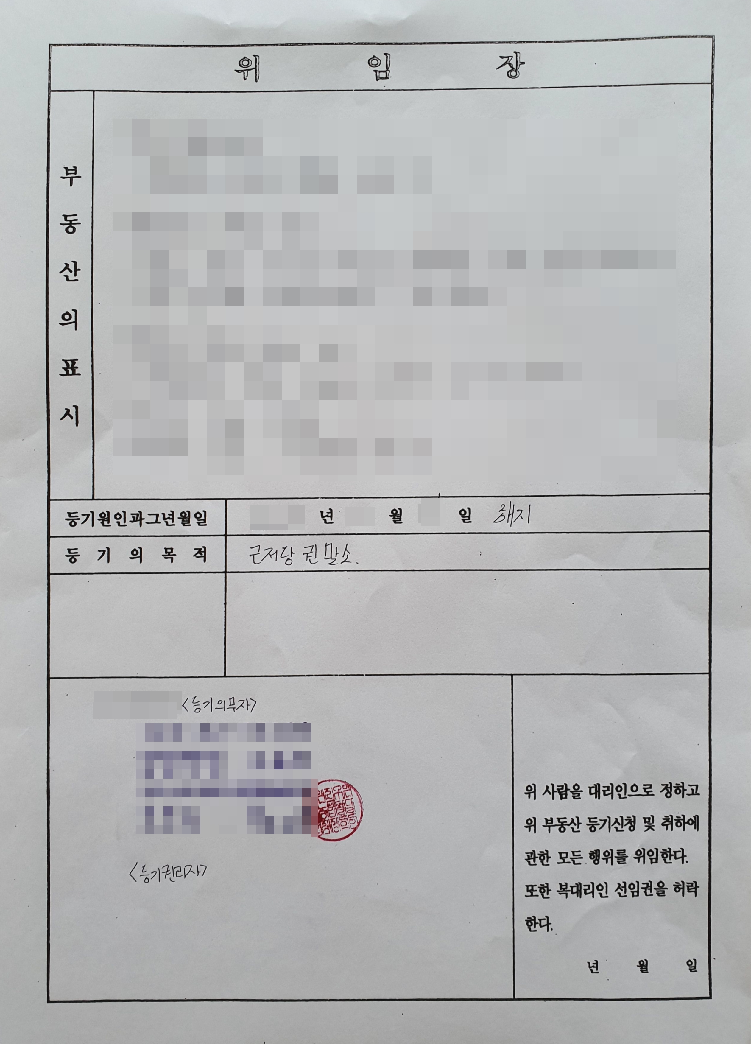 우선 은행에서 수취해야 할 서류들을 살펴보겠습니다. 우선 등기소에 제출하는 위임장 양식은 다음 사진에서 보는 형식으로 구성되어 있습니다. 위임장은 은행에서 근저당권 등기 의무자인 금융기관이 대출금을 완제한 후 근저당권 말소를 원하는 등기권리자인 내게 근저당권 말소등기를 위임한다는 내용의 서류입니다. 근저당권이 설정되어 있는 부동산의 표시를 작성하고, 서류 하단에 등기의무자와 등기권리자를 작성하면 됩니다. 등기의무자는 은행이 되며, 등기권리자는 대출을 완제한 고객이 됩니다.