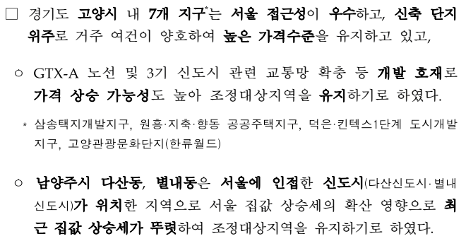 조정지역을 그대로 유지한 고양시 7개 지구에 대해 국토부는 서울 접근성이 우수하고 신축단지 위주로 거주 여건이 양호해 높은 가격수준을 유지하고 있으며, GTX-A 노선과 3기 신도시 관련 교통망 확충 등 개발 호재로 가격 상승 가능성도 높아 조정지역 유지를 결정하기로 하였으며,