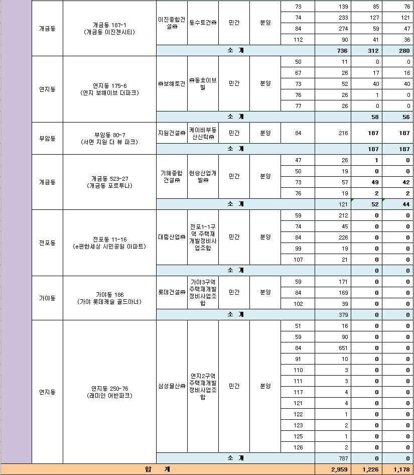 부산진구의 경우, 미분양 가구수가 '19.8월 1,226가구, '19.9월 1,178가구로 부산시 전체 미분양의 약 25%를 차지하고 있는 곳이다. 미분양 단지 상당수가 입지가 다소 외곽이거나 소규모 건설사가 시공한 경우가 많으며, 대규모 단지에 입지가 좋은 단지와 메이저 브랜드 건설사가 시공한 경우는 대부분 미분양이 없는 것으로 파악되고 있다.