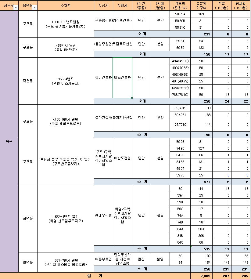 부산시 북구의 경우, 동부토건에서 만덕동신타운 사업을 재건축한 만덕동의 신만덕 베스티움 에코포레 미분양 가구가 231세대 있으며, 그 외의 경우에는 대부분 분양이 완료된 상태다.