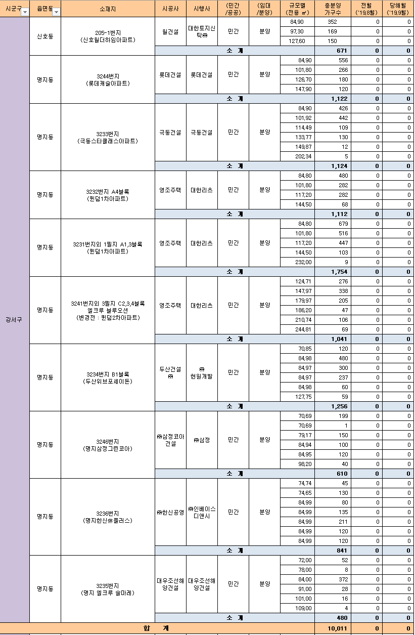 부산시 강서구의 경우 명지신도시 분양이 완료되었으며, 미분양 세대수 0가구로 전 단지 분양이 완료된 상태이다.
