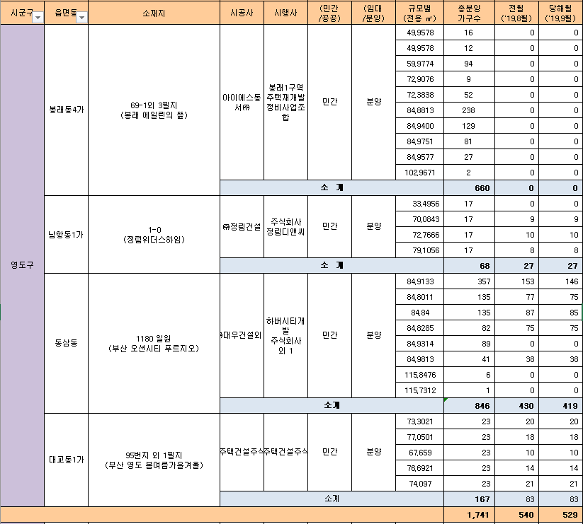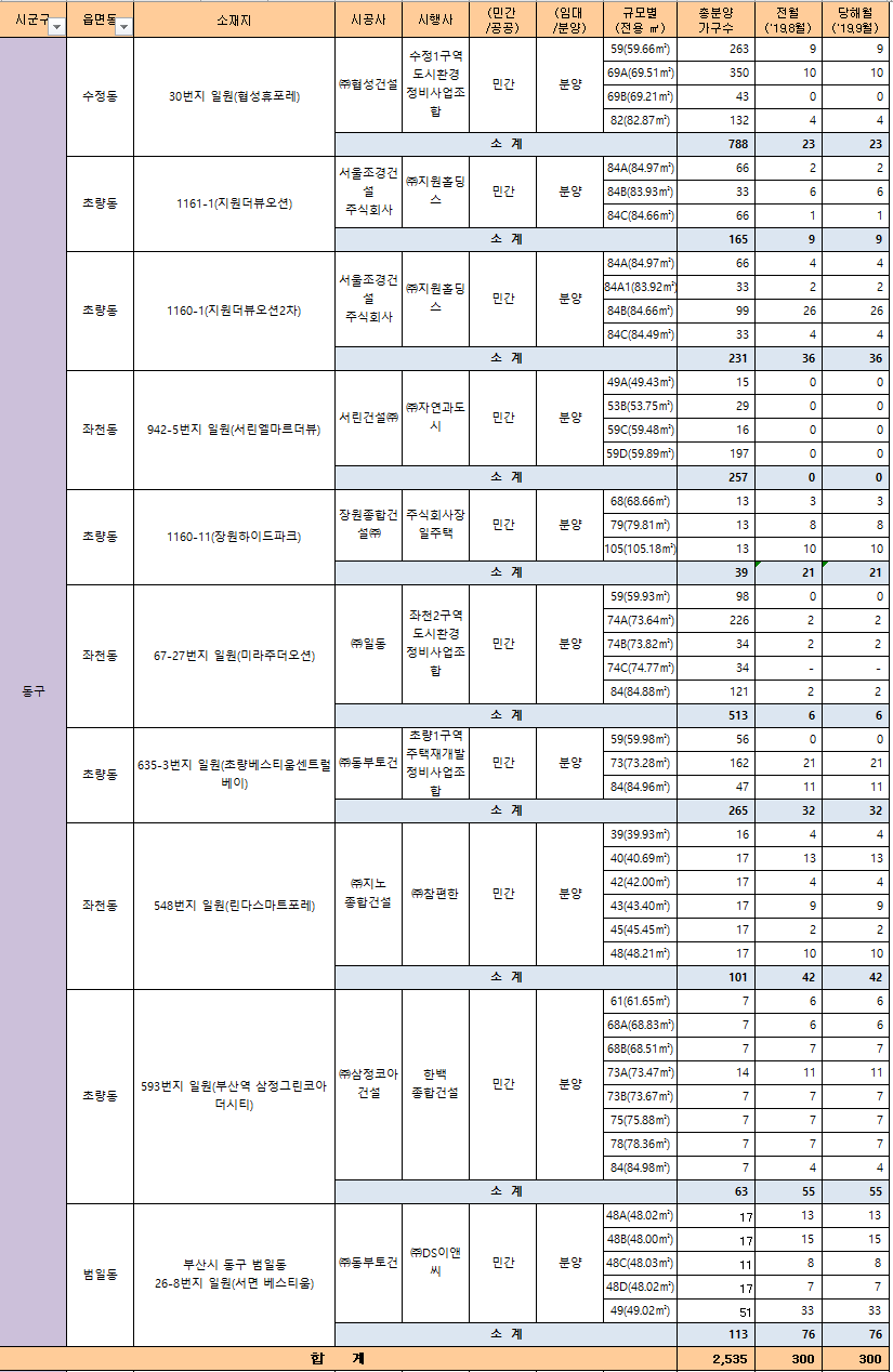부산시 동구의 경우, '19.8월과 '19.9월의 미분양 세대수가 동일하게 300가구인 것으로 파악되며, 초량동 부산역 삼정그린코아더시티 55가구와 범일동 서면 베스티움 76가구 등이 미분양으로 남아있다.