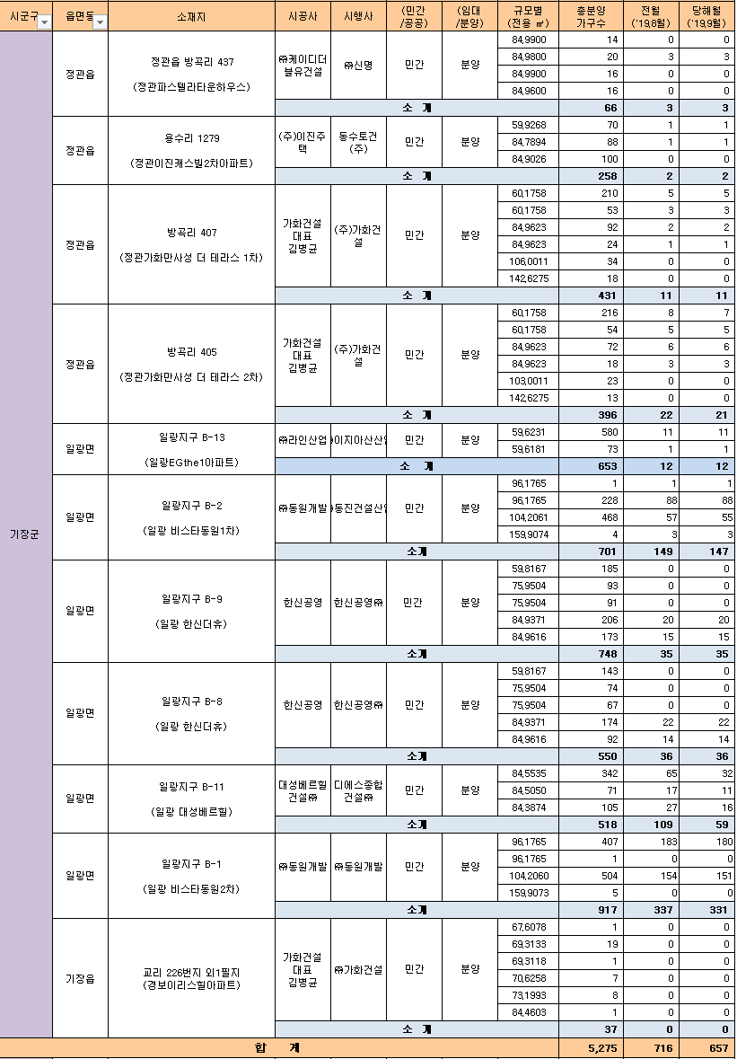 기장군의 경우, 일괄지구 미분양 물량이 아직 적체되어 있다. 미분양 물량은 꾸준하게 감소하고 있으나, 일광면 비스타동원2차와 비스타동원1차, 일광 대성베르힐 등의 미분양 세대가 아직 남아있다.