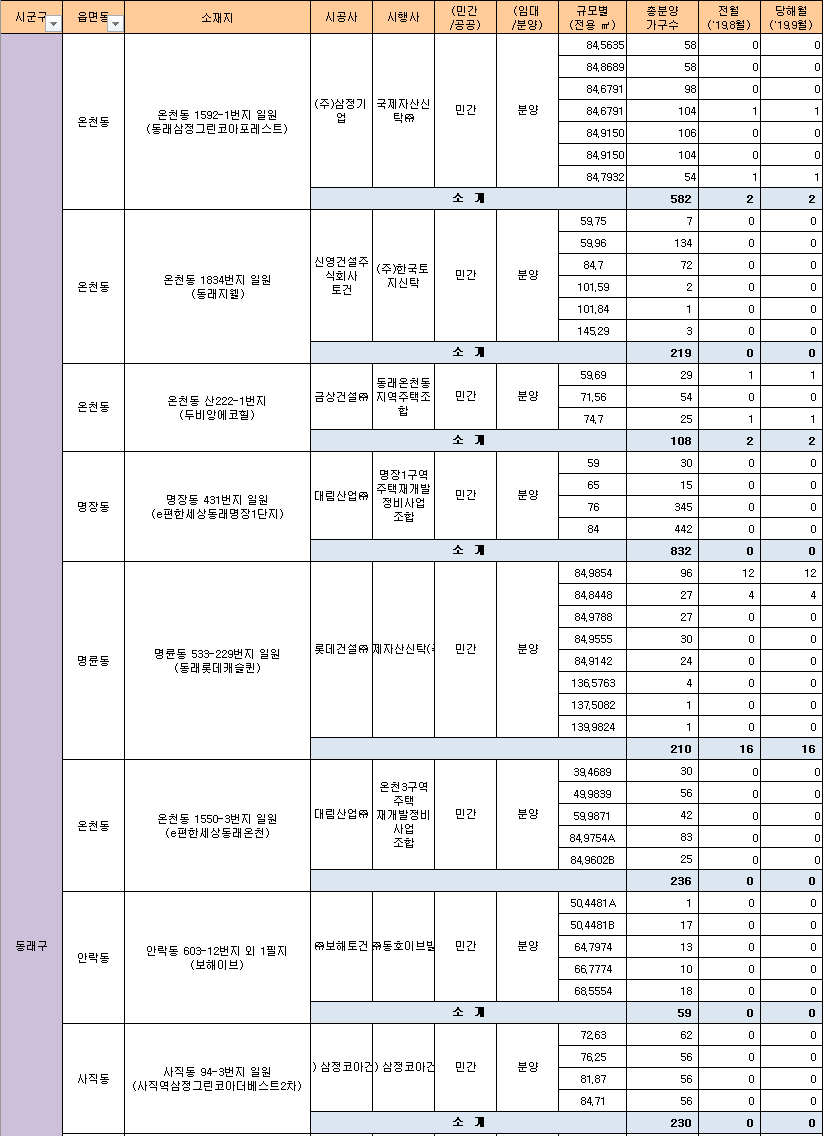 부산시 동래구의 경우, 조정대상지역 지정 중이었던 '19.8~9월에도 미분양 세대는 불과 118세대에 불과했으며, 그나마 명륜2차 힐스테이트 84 52세대가 9월에 추가된 영향이 큰 것으로 파악되고 있다.