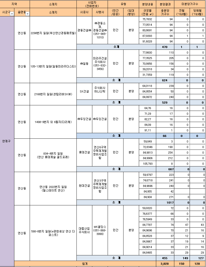 부산시 연제구의 경우, 대림산업이 연산동에 시공한 e편한세상 연산 더 퍼스트 미분양 127가구가 '19.9월 기준으로 남아있다. 그 외의 단지는 대부분 미분양이 모두 해소되었다.
