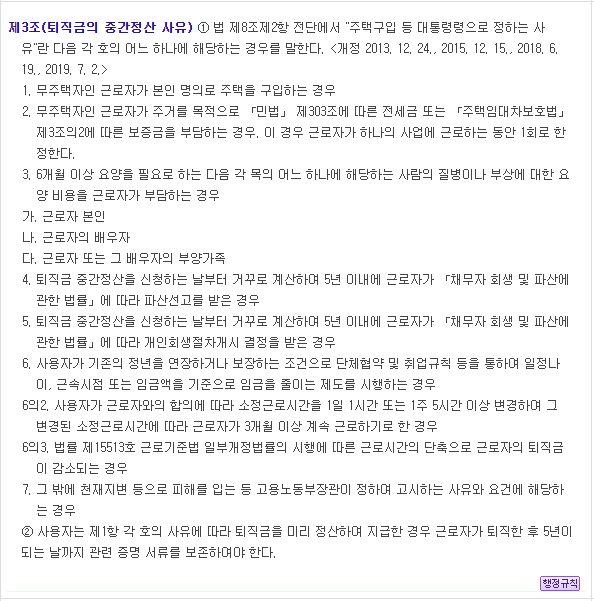 근로자의 안정적인 노후생활 보장을 위해 퇴직금은 근로자퇴직급여 보장법과 시행령, 시행규칙 등으로 규정되고 있는 근로자 고유의 권한 중 하나입니다. 퇴직금의 경우, 무주택자인 근로자가 주택을 구입하는 경우 등과 같이 퇴직금 중간정산 요건이 근로자퇴직급여 보장법 시행령으로 규정되어 있습니다. 시행령 제3조(퇴직금의 중간정산 사유)에 다음과 같이 규정된 경우에 한해서만 퇴직금 중간정산이 가능합니다.