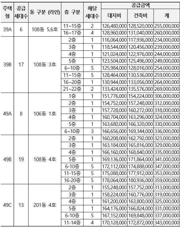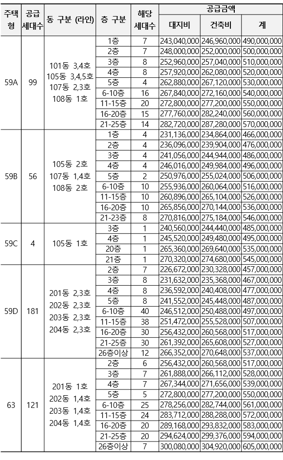 59A 분양가는 최상층(21~25) 기준으로 570,000,000원, 59B 최상층(21~23) 546,000,000원, 59C(21층) 545,000,000원, 59D(26층 이상) 537,000,000원이다. 63㎡ 분양가는 최상층인 26층 이상으로 605,000,000원이다. 마찬가지로 최상층 기준으로 평당(3.3㎡) 분양가는 59A 2,266만원, 59B 2,166만원, 59C 2,163만원, 59D 2,168만원, 63㎡ 2,312만원이다. 최상층임을 감안하더라도, 전반적인 분양가는 기대치보다 상당히 높게 책정되었다.