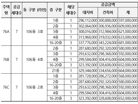 일반공급 물량이 각 7세대에 불과한 76A, 76B, 76C의 경우, 최상층(16~20층) 분양가는 76A 681,000,000원, 76B 664,000,000원, 76C 652,000,000원이다. 평당 분양가는 76A 2,155만원, 76B 2,075만원, 76C 2,035만원이다. 역시 최상층 기준으로 구 평당 2,100천만원 수준의 분양가로 일반분양이 진행될 예정이다.