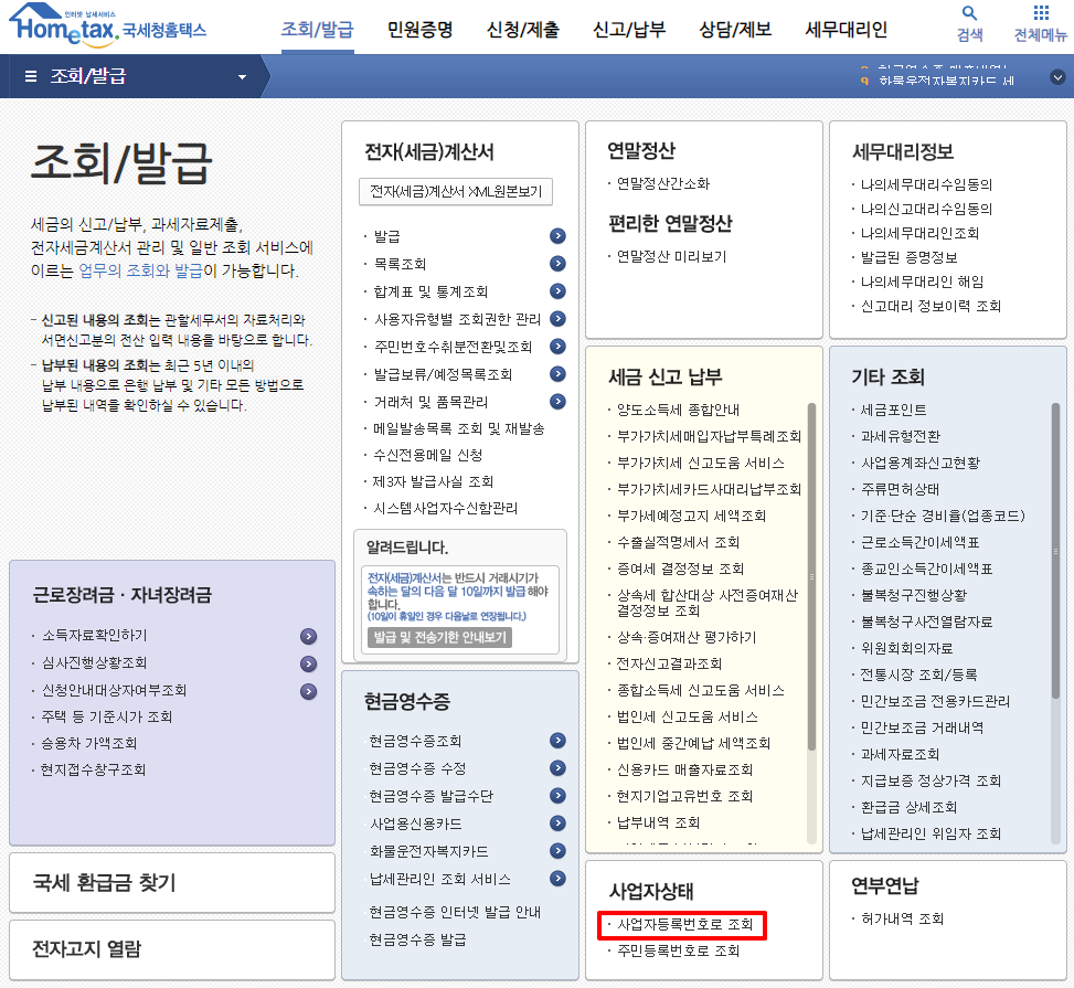 화면 중앙의 사업자등록번호에 사업자등록번호 10자리를 입력 후 조회하기를 선택합니다.