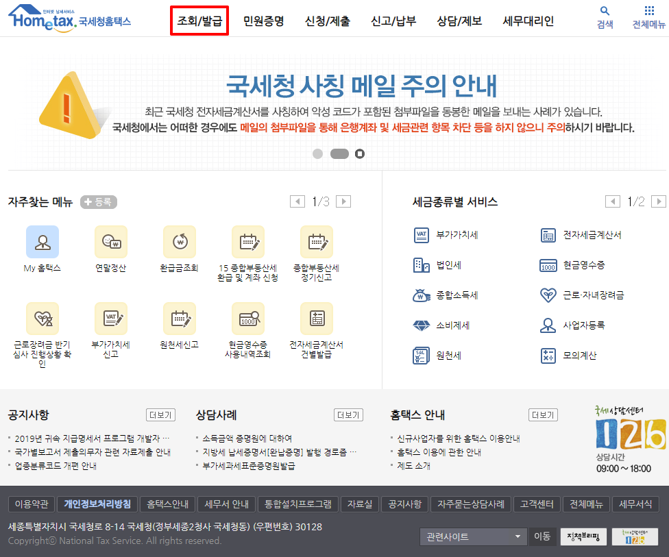 사업자등록번호 조회를 통해 상대방 사업자의 과세유형을 확인하기 위해서는 국세청 홈택스를 활용하면 간단하게 상대방의 과세유형을 쉽게 조회할 수 있습니다. 먼저 국세청 홈택스(www.hometax.go.kr)에 접속 후 상단의 조회/발급 메뉴를 선택하고 화면 하단의 사업자상태 ▶사업자등록번호로 조회 를 클릭합니다.