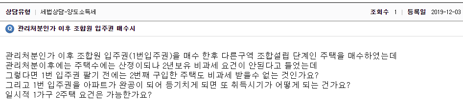 조금 불합리하다 볼 수도 있는 부분이지만, 관리처분인가 후 조합원 입주권은 주택이 아닌 권리의 형태로서 1세대1주택자가 주택을 2년 이상 보유해야 하는 보유 요건을 충족시킬 수 없기 때문이다. 해당 내용은 다음의 국세청 답변에서도 확인할 수 있다.