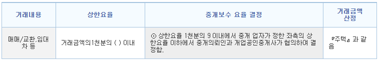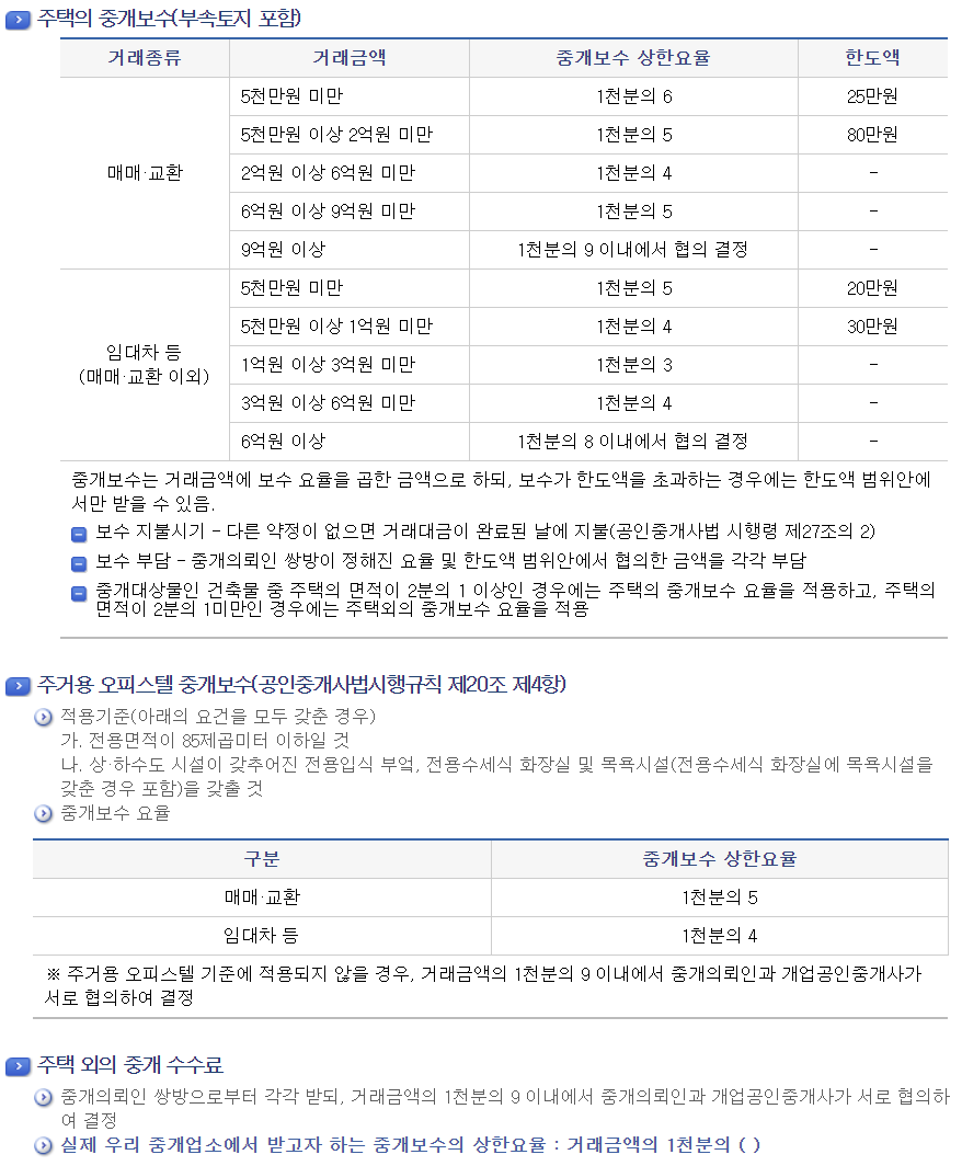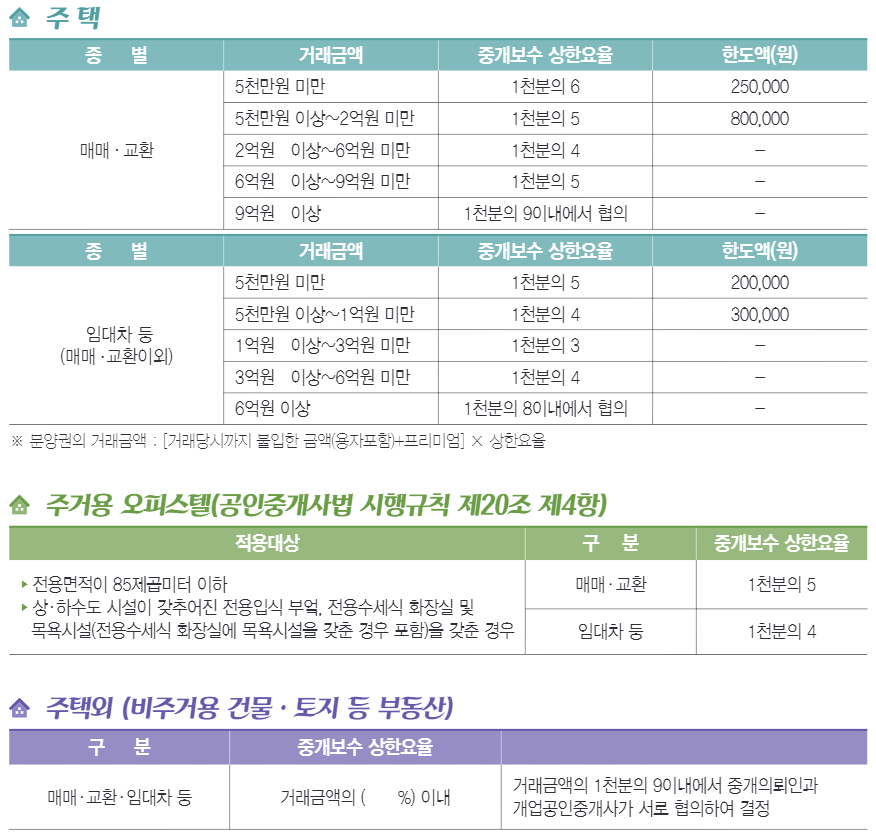 토지나 상가 등과 같이 주택 외의 물건을 거래할 경우에는 매매나 교환 뿐만 아니라 임대차계약 거래의 중개보수 상한요율은 다음과 같이 거래금액의 1천분의 9(0.009%) 내에서 중개업자가 정한 요율표를 기준으로 거래당사자인 중개 의뢰인과 공인중개사가 협의하여 결정하면 된다. 예를 들어, 공인중개사가 토지나 상가 중개 시 중개수수료를 1천분의 8로 정해 놓았다면, 중개 의뢰인은 해당 요율 이내에서 공인중개사와 협의 후 중개수수료를 지급하면 된다. 하지만, 대부분의 경우 최고 상한요율을 중개수수료율표로 책정하는 경우가 많으므로 사전에 먼저 중개수수료 요율을 협의하는 것이 중개수수료를 절감할 수 있는 방법이다.