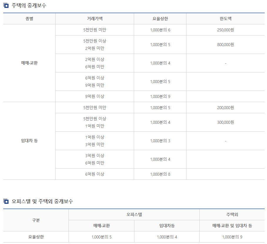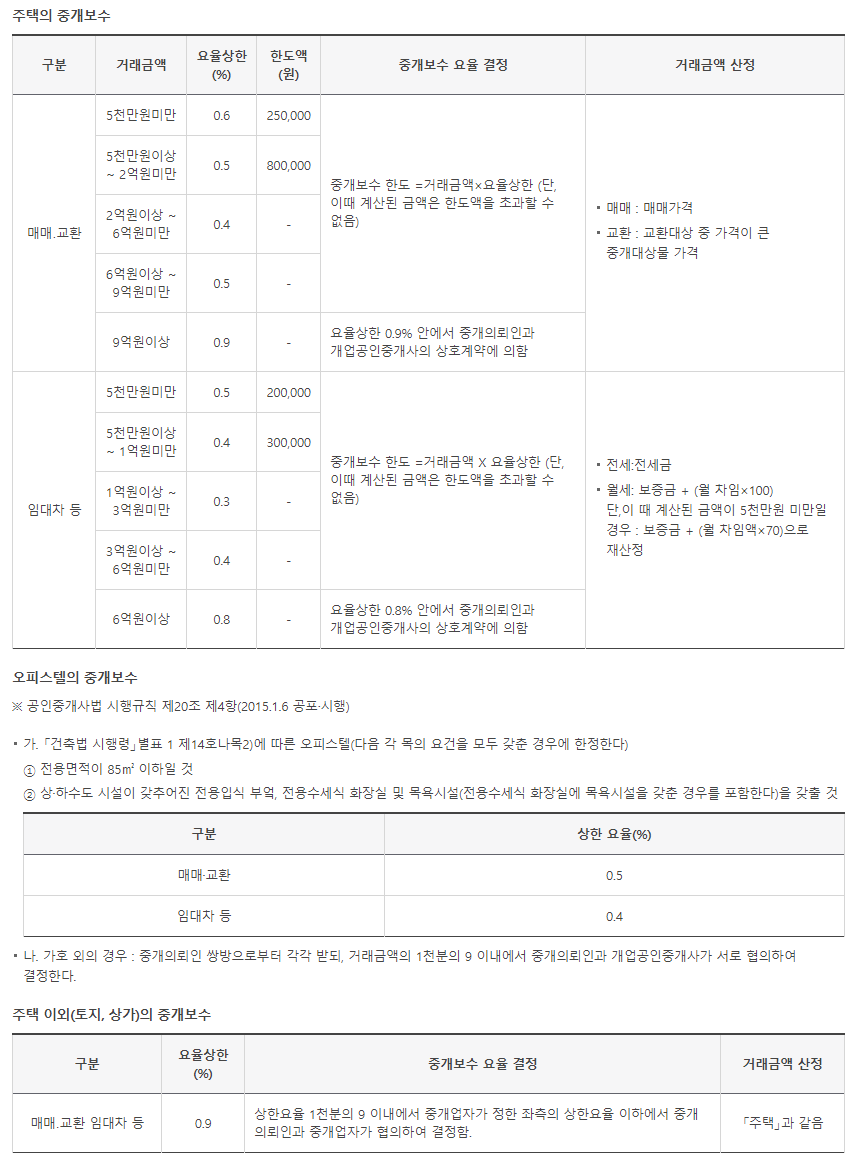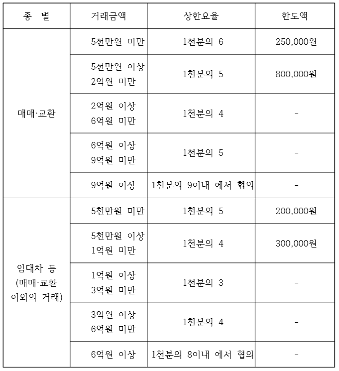 만일, 서울시 오피스텔 매매나 교환 거래인 경우 부동산 중개보수 요율표는 상한요율이 거래금액의 1천분의 5(0.005%)이며, 임대차계약 거래의 부동산 중개보수 요율표는 상한요율이 거래금액의 1천분의 4(0.004%)이므로 해당 상한요율표에 따라 규정된 상한액까지만 중개수수료를 지급하면 됩니다.