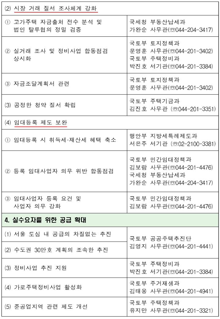 또한, 민간택지 분양가 상한제 적용지역 확대와 고가주택 자금출처 전수 분석 등 주택 구입자금에 대한 조사체계 강화 등을 통해 서울을 중심으로 한 주택가격의 국지적 과열상승을 막고 공급부족론 등에 의한 불안심리를 잠재우겠다는 것이다. 청약 재당첨 제한 요건도 강화하고, 서울 도심 내 신규주택의 차질없는 공급과 수도권 30만호 주택 신축계획도 조속히 추진할 계획이다. 주택임대사업자에 대한 취득세와 재산세 혜택도 추가로 축소하고, 임대사업자 합동점검과 등록요건 강화, 의무 강화 등의 추가 규제책도 내놓았다.
