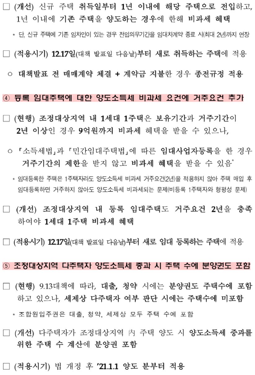 신규 주택 취득일부터 1년 이내에 해당 주택으로 전입하고, 1년 이내에 기존 주택을 양도하는 경우에 한해 비과세 혜택을 부여할 계획이다. 해당 규정의 적용 시기는 12.17일부터 새로 취득하는 주택에 대해 적용된다.