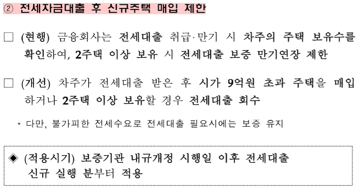 전세자금대출을 받은 후 시가 9억원 초과 주택을 매입하거나 2주택 이상 보유할 경우 전세대출을 회수하는 등 신규주택 매입을 규제할 계획이다.