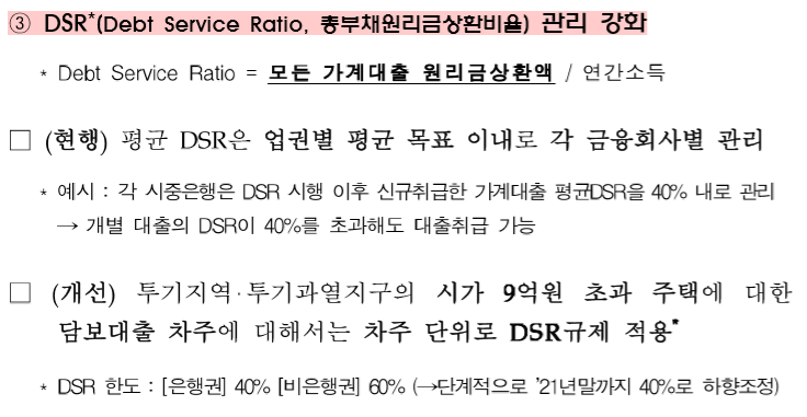 투기지역과 투기과열지구의 시가 9억원 초과 주택에 대한 담보대출 차주에 대해 차주 단위로 DSR 규제 적용
