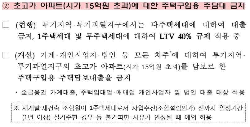 2. 시가 15억원 이상 초고가 아파트의 주택구입용 주담대 금지
