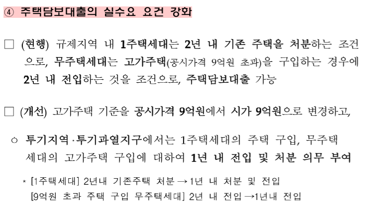 고가주택 기준을 공시가격 9억원에서 시가 9억원으로 강화 변경하고, 투기지역과 투기과열지구에서 1주택 세대의 주택 구입과 무주택 세대의 고가주택 구입에 대해 1년 내 전입과 처분 의무를 부여하는 등 주택담보대출의 실수요 요건을 강화한다.
