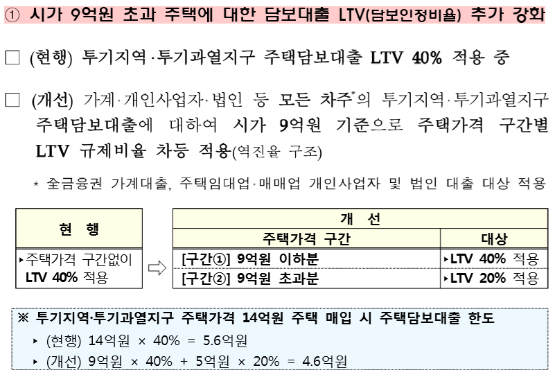 1. 시가 9억원 초과 주택에 대한 LTV 추가 강화