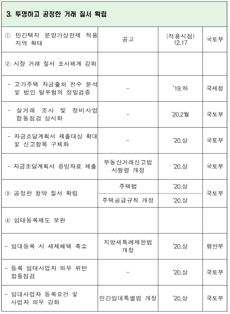 정부는 12.16 부동산대책의 원인으로 지적된 편법과 불법 증여, 대출규정 미준수, 공급부족에 따른 불안심리 등의 해소를 위해 대출규제 사각지대를 해소해 대출규제를 추가로 강화하고, 종부세 강화와 공시가격 상향, 실거주하지 않는 주택의 양도차익 과세를 통한 양도세 강화, 분양가 상한제 지역 확대, 서울과 수도권 30만호 공급 계획 차질없이 추진 등의 내용을 주요 대응 방향으로 설정하였다.