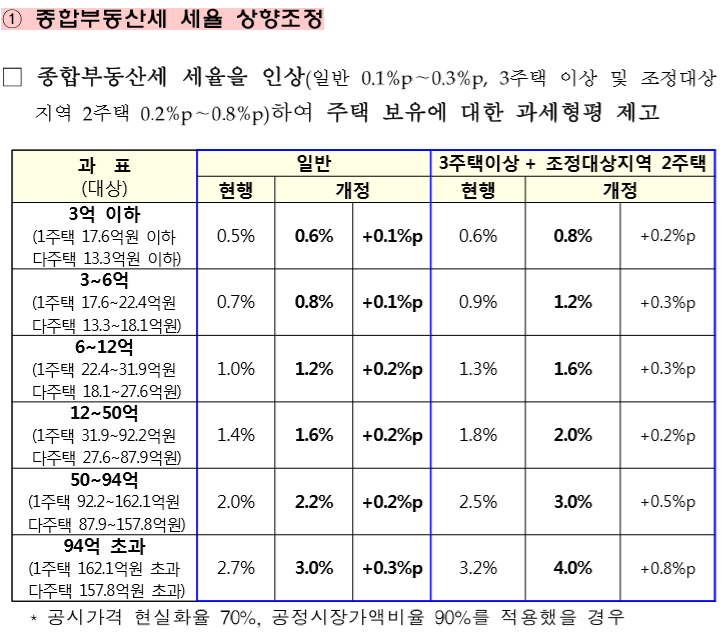 정부는 종부세 세율을 3주택 이상 및 조정대상지역 2주택자에 대해 0.2%~0.8%로 인상하여 종부세 보유 부담을 강화할 방침이다. 이로써 공시가 상향 조정과 함께 종부세 세율도 강화하면서 다주택자와 고가주택의 보유세 부담이 크게 늘어나게 되었다. 주택 구입과 처분까지 주택 보유자에게 부과되는 세금 중 가장 큰 비중을 차지하는 종부세와 양도세 중 하나인 종부세 규제를 추가로 강화함으로써 다주택 보유를 규제할 방침이다.