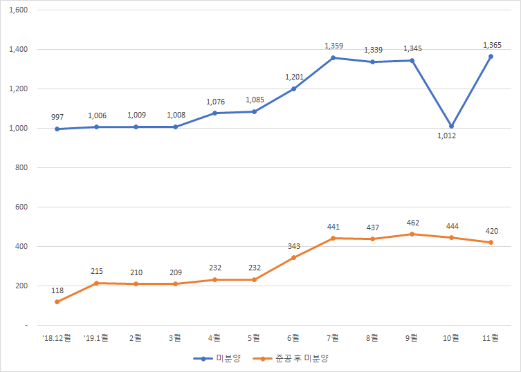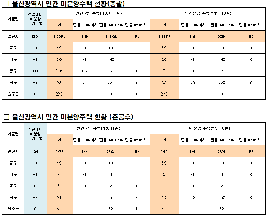 월별 미분양 증가 내용 중 '19.9월과 '19.11월 사이의 급격한 변동, 즉 '19.10월 1,345세대 '19.11월 1,012세대로 미분양 가구수가 대폭 감소 후 증가한 것은 문수로 두산위브 더제니스, 남산드림파크 등 기존 미분양 세대수가 대폭 감소한 이후 '19.10.16일 청약한 울산시 동구 전하동 울산미포산단 인근에 위치한 KCC스위첸 웰츠타워 미분양 가구수가 378세대가 증가하였기 때문이며 , 이로 인해 '19.11월 기준 1,365세대의 미분양을 기록하고 있습니다.