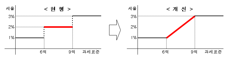 2020.1.1일부터 확정 시행될 취득세 제도 개편에 따라 ①6억원 초과~9억원 이하 주택의 유상거래에 대한 취득세율 계산은 취득가액 X 2/3 - 3억원으로 계산하면 되며, 6억원 초과~7.5억원 이하의 주택 세율은 1~2%로 기존보다 취득세율이 낮아지거나 동일하게 되며, 7.5억원 초과~9억원 이하 주택 취득세율은 기존 2%에서 2~3%로 높아지게 된다.