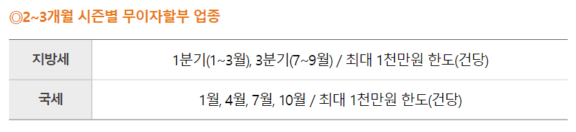 우리카드의 경우, 국세와 지방세별로 2020년 무이자할부를 제공하는 기간이 상이하게 구분되어 있습니다. 지방세의 경우 2020년 1분기와 3분기에 한해 최대 1천만원 한도(건당)로 제공하며, 국세의 경우에는 1월과 4월, 7월, 10월에 한해 최대 1천만원 한도(건당) 최대 3개월까지 무이자할부를 제공합니다.