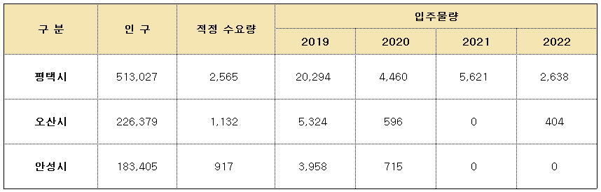 오산시는 2019년 약 5배에 달했던 입주물량이 2020년 이후에는 적정 수요량의 절반 이내 수준으로 물량이 공급될 것으로 추정되며, 자체적으로 수요가 가능한 수준이라고 예측할 수 있다. 안성시의 경우도 2019년 입주물량이 적정 수요량의 4배 수준에 달했으나, 2020년부터는 적정 추정 수요량 이내로 입주물량이 감소하고, 2021년부터는 입주물량이 전무할 것으로 추정되고 있다.