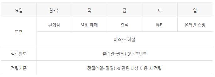 편의점 5% 적립은 GS25, CU, 세븐일레븐, 이마트24 등 주로 이용하는 편의점 모두가 해당되며, 편의점 인터넷이나 모바일앱을 통한 온라인 거래는 할인 적용되지 않는다. 만일 편의점에서 물건을 수시로 구매하는 사용자에게는 유용하게 사용될 서비스이다.