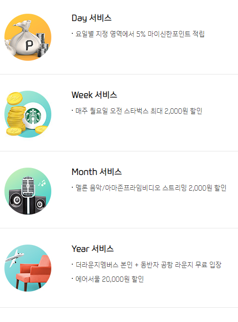 요일별 지정영역에서 5%의 마이신한포인트를 적립 주는 서비스가 신한디데이카드의 결정적 선택 이유가 될 것이며, 월요일부터 수요일까지는 편의점, 목요일은 영화 예매, 금요일은 요식업, 토요일은 뷰티, 일요일은 온라인 쇼핑에서 5%의 포인트를 적립해 준다. Day 서비스를 받기 위한 조건은 전월 실적 30만원 이상인 경우에 가능하며, 월 최대 적립한도는 3만 포인트까지 가능하다.