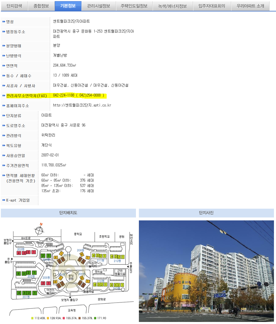 예를 들어, 대전시 중구 문화동에 위치한 센트럴파크 2단지 아파트의 단지 종합정보를 살펴보면, 센트럴파크2단지의 아파트 관리비와 유지관리 이력, 유지보수 내용별 업체 입찰 현황 등을 상세하게 확인할 수 있다. 또한, 문화동 센트럴파크2단지 아파트의 기본정보를 선택하면, 아파트의 전반적인 주소, 면적, 세대, 단지배치도 정보 등 기본 정보와 함께 아파트 관리사무소 연락처도 쉽게 확인이 가능하다. 이렇게 K-apt를 통해 전국에 소재한 아파트 관리사무소의 모든 연락처를 쉽게 파악할 수 있다.