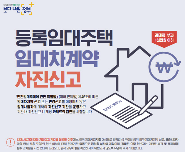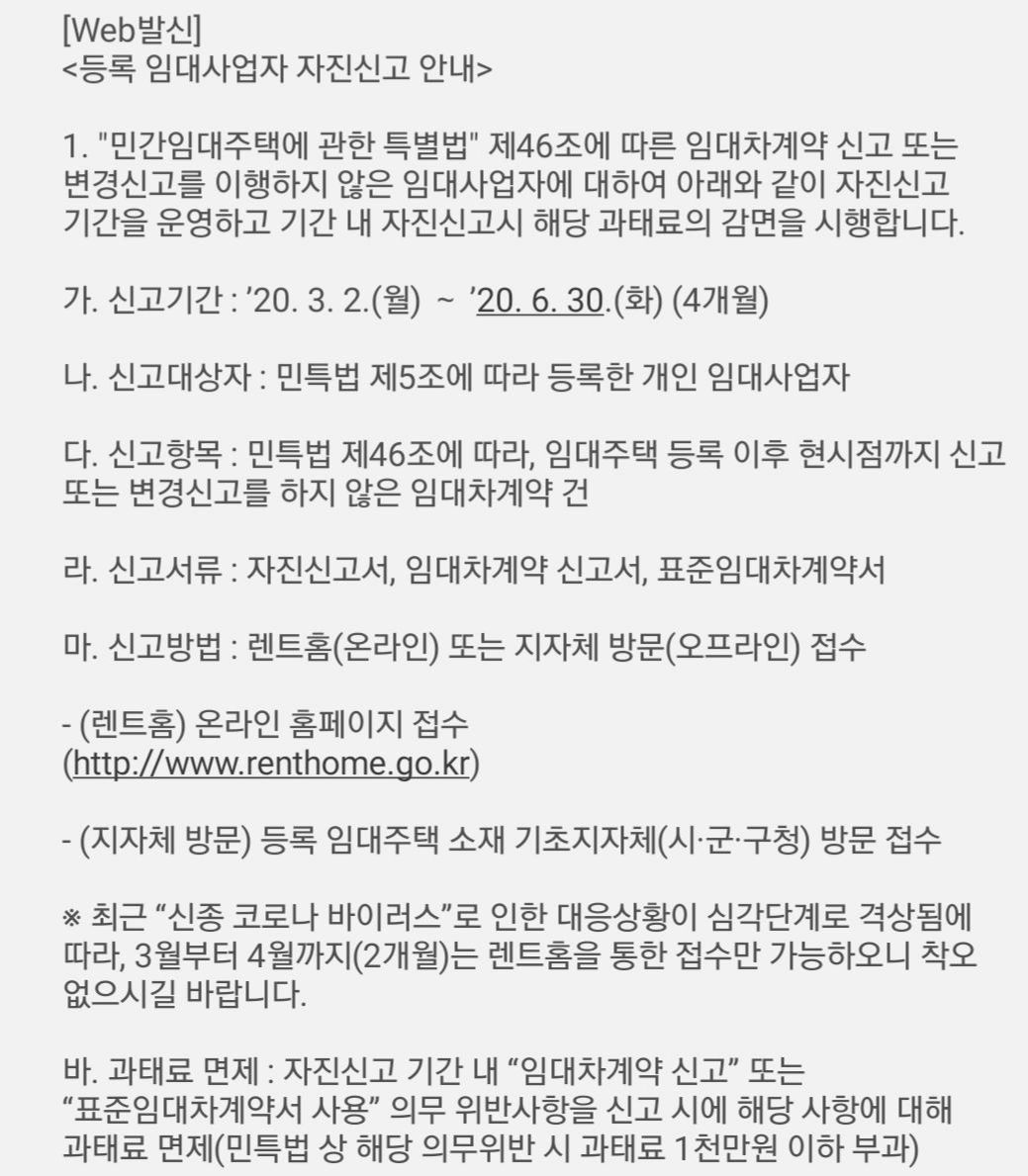 자세한 내용인즉, 민간임대주택에 관한 특별법 제46조에 따른 임대차계약 신고 또는 변경신고를 이행하지 않은 주택 임대사업자에 대해 자진신고 기간을 주고 자진신고한 경우 해당 과태료의 감면을 시행하겠다는 내용이었다. 신고기간은 '20.3.2(월) 부터 6.30(화)까지 4개월로 민간임대주택 특별법에 따라 등록한 개인 임대사업자가 대상이었다.