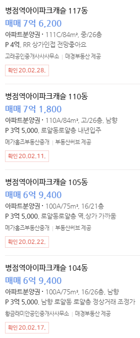 병점역을 중심으로 신축 아파트로 병점역세권에 위치한 병점효성 해링턴플레이스의 경우 '19년말 2억후반에 거래되었던 매물들이 84㎡가 2월 이후 상승폭을 확대하면서 4억을 뛰어넘어 모두 거래완료되며 매물이 실종되어 '20.3월초 기준 호가가 4억 중반까지 상승하였다. 구축 아파트의 경우 거주환경이 좋은 정든마을 신창2차 비바패밀리의 38평형(101㎡)가 '19년 11월과 12월 거래건수가 불과 2건에 불과했으나, '20.1월과 2월 무려 23건 이상이 거래되면서 2억7천만원 수준에서 거래되었던 매물들이 모두 거래 완료되면서 최근 3억5천만원까지 가격이 상승하면서 최근 지속적으로 하락했던 아파트 가격이 수년전 거래가격으로 회귀한 양상이다.