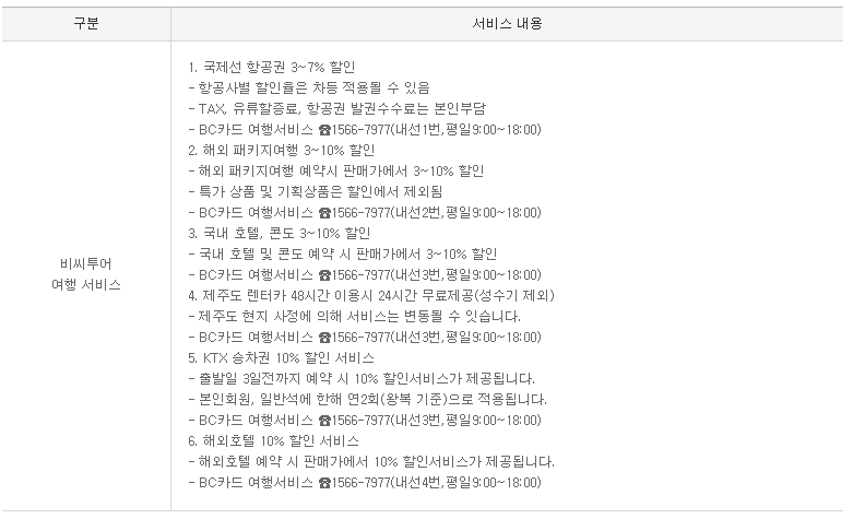추가로 제공되는 혜택 중 비씨투어 여행서비스 또한 괜찮은 혜택들이 상당 수 제공되고 있다. 국제선 항공권 할인과 제주도 렌터카 24시간 무료이용 혜택, KTX 승차권 10% 할인 서비스, 해외호텔 10% 할인 서비스 등이 그것이다. 다만, KTX 승차권 10% 할인서비스는 연 2회만 적용되며, 출발 3일 전까지 예약시에만 10% 할인 혜택이 적용되며, 일반석에 한해서 왕복 기준으로 적용이 가능하다.